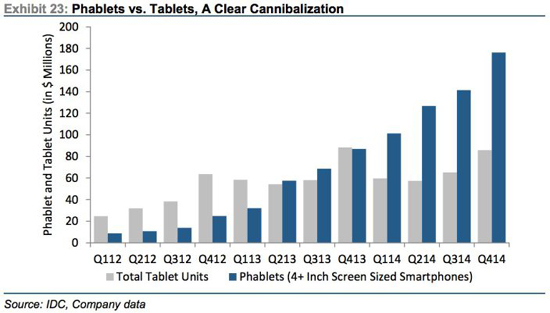 Согласно подсчетам экспертов Credit Suisse, взявших за основу сведения, собранные специалистами IDC, смартфоны с диагональю экрана от 4 дюймов и больше планомерно съедают продажи планшетов.