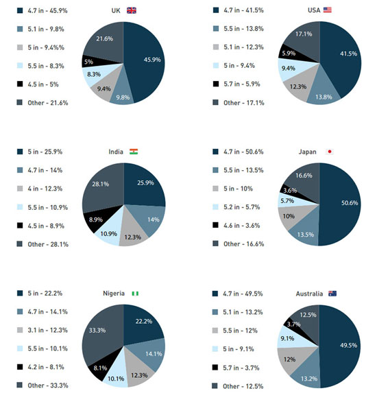 Самой распространенной диагональю считается 4,7 дюйма: за нее проголосовала почти половина респондентов из США, Японии, Австралии и Великобритании. Нашлись, конечно, страны, где пользователи выступают за 5 дюймов, но вот поклонников диагонали 5,5 дюйма и выше оказалось очень мало.