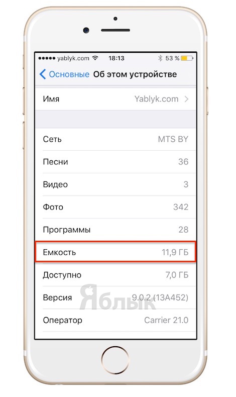 Однако если посмотреть на информацию, отображаемую, например, в настройках iPhone 6 с iOS 9.0.2 (Настройки -> Основные -> Об устройстве), то можно увидеть не 14,9 Гб, а 11,9 Гб. Куда же могли подеваться ещё 3 Гб?