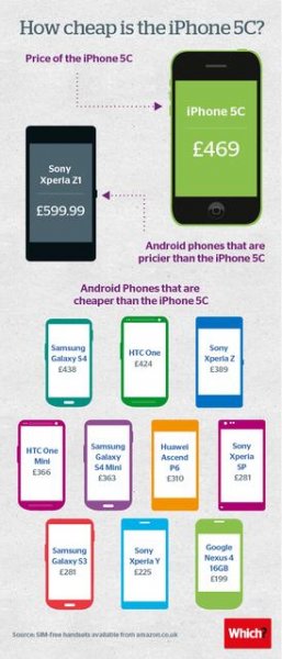 Сотрудники Which? Tech Daily составили инфографику, в которой рассказывает о 10 различных Android-смартфонах, которые дешевле iPhone 5C. Издание задается вопросом: почему потребитель должен столько платить за iPhone 5C, если за те же деньги или дешевле он может приобрести Samsung Galaxy S4, HTC One или Sony Xperia Z? Единственные Android-смартфоны, которые стоят дороже iPhone 5C - это Sony Xperia Z1 и Samsung Galaxy Note 3, которые, понятное дело, нужно сравнивать с iPhone 5S.