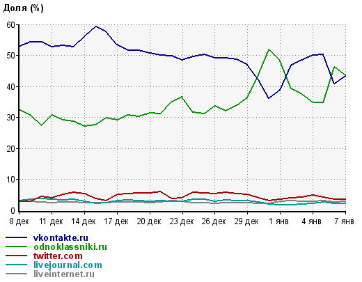 Согласно статистике Liveinternet.ru, 27 декабря 2012 начался резкий спад количества переходов по ссылкам из социальной сети ВКонтакте. График пошел вверх после 2 января, затем последовал новый спад.