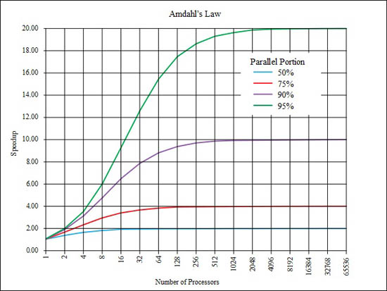Последние 8 лет Intel и AMD фокусируют свои усилия на многоядерных процессорах, как решении для увеличения производительности. Но есть ряд причин считать, что это направление себя практически исчерпало. В первую очередь – увеличение числа ядер никогда не дает идеального увеличения производительности. Производительность любой параллельной программы ограничена частью кода, не поддающейся распараллеливанию. Это ограничение известно как закон Амдала и иллюстрируется следующим графиком.