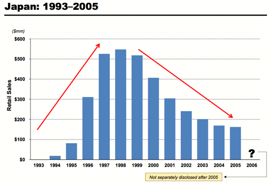 Видно, что выручка напрямую связана с выходами на новые рынки. В конечном итоге страны в мире кончатся, что будет означать и конец бизнеса Herbalife, если они не придумают какую-то другую долгосрочную и более устойчивую модель.