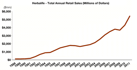 Пример с кафе-вафельными может выглядеть несколько надуманным, поэтому куда интереснее взглянуть на настоящий бизнес. Herbalife — это компания, производящая пищевые добавки и рекламирующая их как полезные для здоровья. Но в отличие от конкурентов вроде Slim-Fast или Ensure, найти товары Herbalife в ближайшем супермаркете не выйдет. Вместо продаж через ритейл-сети, компания привлекает к продажаем индивидуальных представителей, которые зарабатывают на комиссии. Представители Herbalife также привлекают к работе новых людей, и за каждого нового работника им также полагается комиссия. Рост компании за последние десять лет выглядит очень хорошо: