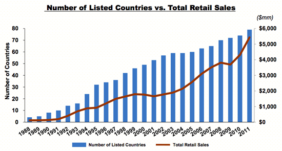 Похожий сценарий наблюдался также в Испании, Франции, Германии и некоторых других странах. Вот так выглядит график соотношения роста выручки компании и числа новых рынков, на которые осуществлялся выход: