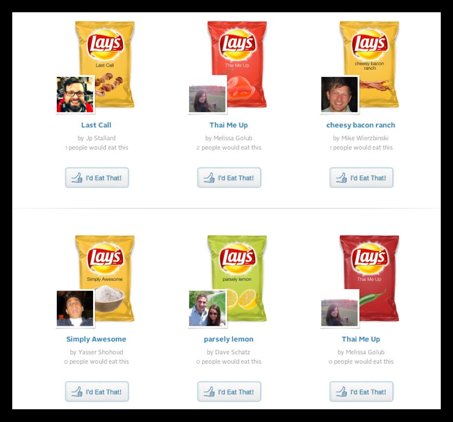 Например, Lays запустили кампанию, где пользователи могут создавать новые вкусы для чипсов, а также голосовать за вкусы, созданные другими. Компания пообещала добавить в производство чипсы с тем вкусом, который наберет больше всего голосов. За месяц приложение установили более 1 миллиона человек, а значит, десятки миллионов пользователей увидели эти посты в своих лентах.