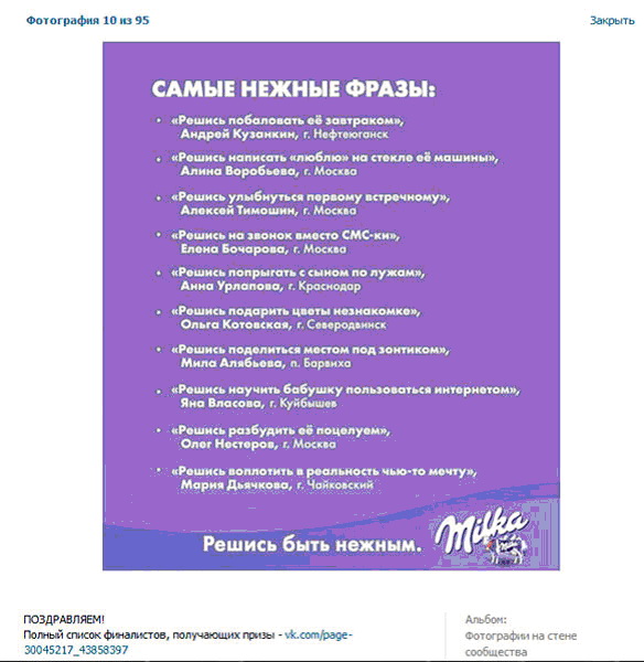 Бренд Milka весной запустил в соц.сети Vkontakte рекламную кампанию «Решись быть нежным». По условиям конкурса, юзерам необходимо было предложить свой вариант нежной фразы, начинающийся со слова «Решись...». 10 лучших фраз попали на упаковку шоколада Milka », - рассказывает Юлия Кожинова, бренд-менеджер Milka.