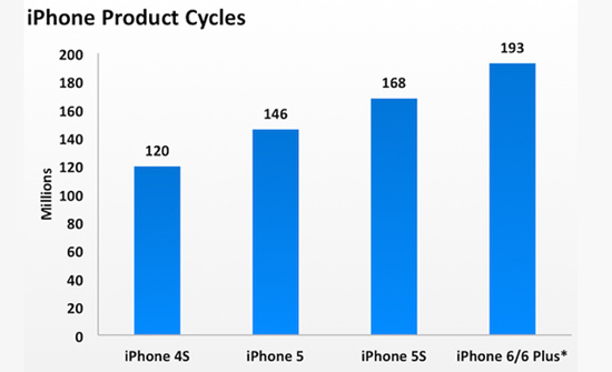 Быть может, стоит перейти от долей к абсолютным значениям? Второй график демонстрирует совершенно иную картину – нетрудно заметить, насколько выросли объемы производства iPhone за считанные годы. При этом цикл iPhone 6 и iPhone 6 Plus еще не завершен, данные приведены в приближенном виде, так что итоговый вариант диаграммы, который составят в начале следующего года, будет выглядеть куда более внушительно. И обязательно спровоцирует бессонницу и плохой аппетит у держателей ценных бумаг – осилит ли якобы всемогущая корпорация Apple такое препятствие?
