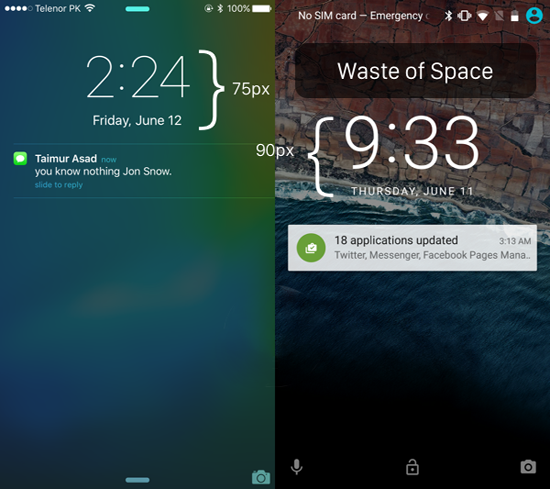 Любовь к фаблетам и смартфонам с размером 5.0''+ появилась у владельцев Android неспроста. Система, выполненная в Material Design смотрится симпатично, но нерациональность использования экранного пространства удручает. На iOS 9 помещается в два, а иногда и в три раза больше информации из-за отсутствия лишних отступов, переизбытка графических элементов и прочих моментов, "сжирающих" полезную площадь экрана.