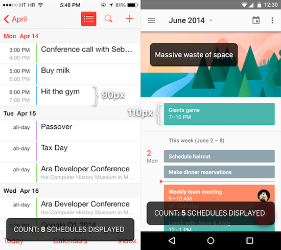 Почему пользователи Android и iOS настолько отличаются? Одни ратуют за большие диагонали дисплеев, в то время, как другие еще не так давно убеждали, что 4-дюймов хватает за глаза. Вряд ли на мнение людей влияют лишь фанбойские предпочтения. Сравнение интерфейсов iOS 9 и Android M наглядно аргументирует тягу любителей Зеленого робота к большим диагоналям.