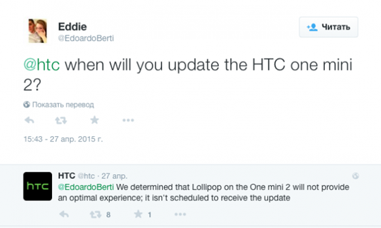 HTC One mini 2, мини флагман компании 2014 года не получит обновление до Lollipop: