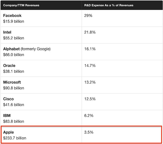 Не так давно мы узнали о том, что за минувший финансовый год яблочный бренд заработал немногим более $233 млрд. Согласно последней сводке Bloomberg Businessweek, лишь 3,5% этих денег было пущено на финансирование по статье R&D (Research and Development). В то время как Cisco тратит 12,5%, Alphabet (Google) более 16%, а Facebook и вовсе 29%.