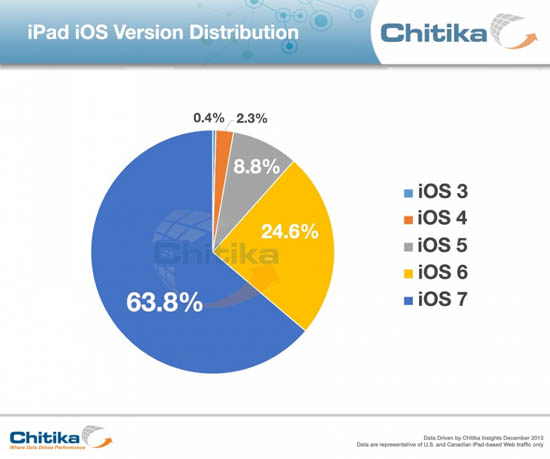 Всего 63,8% всех iPad работают на операционной системе iOS 7, в то время как iOS 6 все еще установлена на почти четверти планшетов Apple.