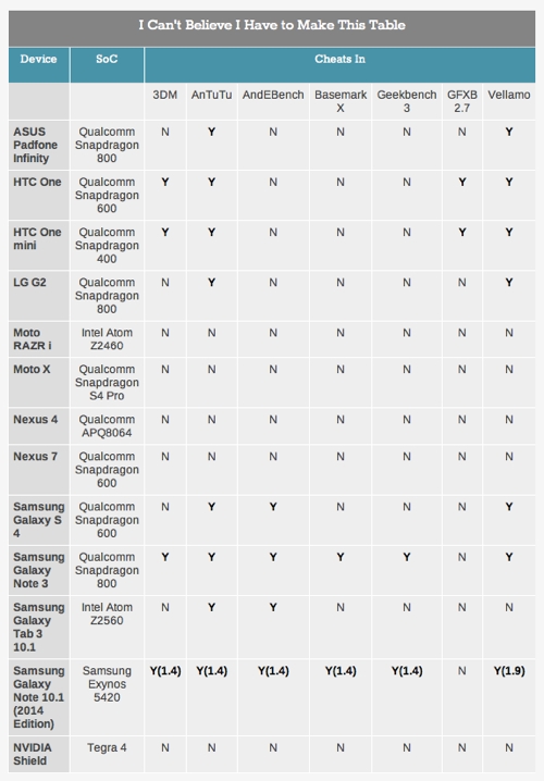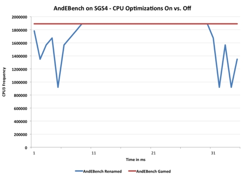 Тогда в лаборатории AnandTech был протестирован смартфон Samsung Galaxy S4 с процессорами Samsung Exynos 5410 и Qualcomm Snapdragon 600. Эксперты заметили, что устройство автоматически определяет запуск некоторых тестов и повышает частоту процессора за пределы максимально допустимого тепловыделения.
