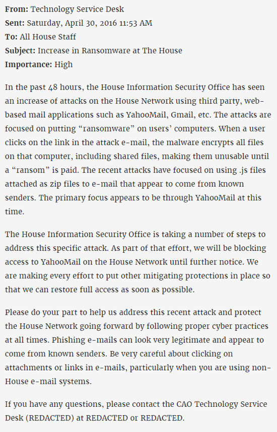 В распоряжении журналистов Gizmodo оказалось письмо, датированное 30 апреля 2016 года. Послание было разослано всем служащим Конгресса США и написано оно сотрудниками IT-департамента. В тексте сообщается, что в последние 48 часов сотрудники IT-департамента Конгресса заметили значительный прирост атак, направленных на распространение вымогательского ПО. Злоумышленники использовали сторонние почтовые приложения (YahooMail, Gmail и так далее) для распространения вредоносных писем, стремясь заразить служащих Палаты представителей шифровальщиками.