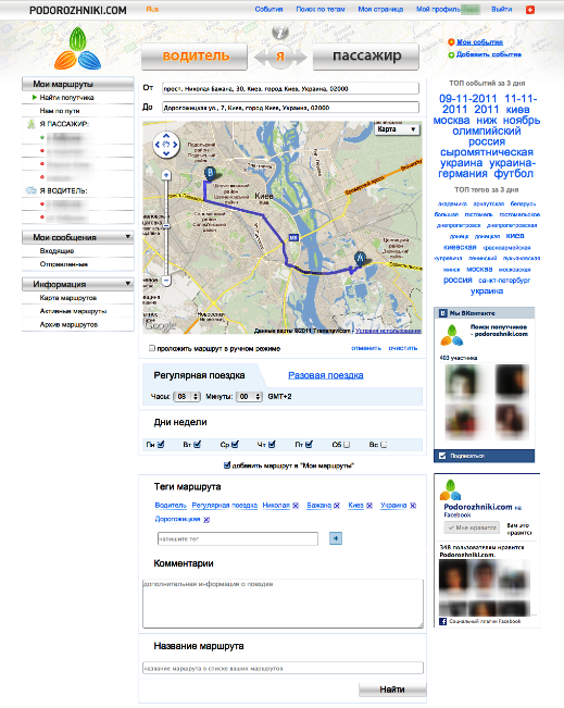 и система автоматически подбирает вам попутчиков (анализируя не названия, которые вы указали, а именно координаты всех точек маршрута) наиболее соответствующих параметрам вашего маршрута. Если сразу таковых не нашлось, то вы будете уведомлены по email, как только попутчики появятся. Тут же, есть возможность поделиться маршрутом в социальных сетях.