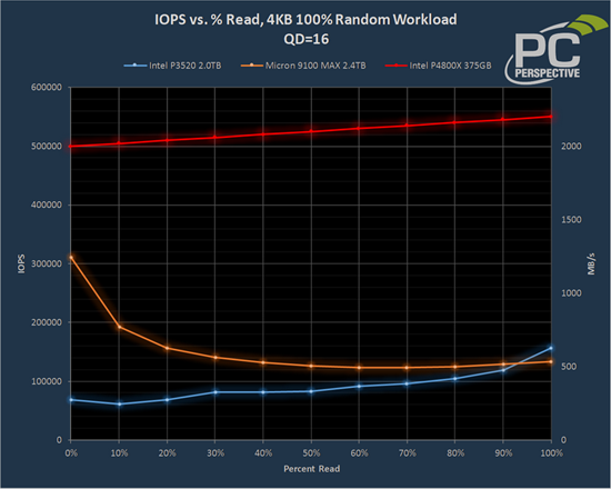 Как сообщает ресурс PC Perspective, примерно так себя они и ведут. На первой же диаграмме, демонстрирующей количество IOPS при случайном чтении блоками по 4 Кбайт в сценарии со 100 % чтения производительность DC P4800X не только не падает, она даже несколько растёт, причём, и линейная скорость, начинающаяся с отметки 2 Гбайт/с, тоже постепенно возрастает. А вот накопитель Micron 9100 MAX с его заявленными 750 тысячами IOPS для модели объёмом 2,4 Тбайт едва переваливает за отметку 300 тысяч, а на 40 % и вовсе скатывается ниже отметки 130 тысяч IOPS. Накопитель Intel P3520 держится неплохо, но он в пять раз уступает DC P4800X, что является отличным свидетельством преимущества новой технологии.