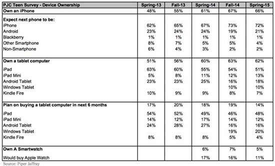 Несмотря на низкий интерес к Apple Watch, iPhone и iPad пользуются большим спросом у подрастающего поколения. У 66% подростков есть iPhone (в осеннем опросе результат был 67%), а 64% владеют iPad (66% в опросе осенью 2014).