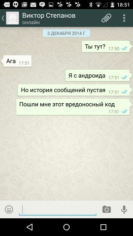 В то же время при использовании версии WhatsApp для iOS данную уязвимость обнаружить не удалось. Получаемый в чате код никак не влиял на работу приложения.