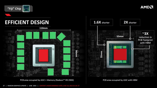 Весьма любопытно, что, в отличие от Fury, Advanced Micro Devices решила наделить Nano полноценным ядром Fiji XT с 4096 поточными процессорами, 256 текстурными блоками и 64 модулями растровых операций (RBE). Официально это пока не подтверждается, но и не опровергается. Разумеется, система охлаждения Nano, представляющая собой скромный одновентиляторный кулер, не cможет справиться с той же нагрузкой, что и специальная СЖО, установленная на Fury X, поэтому частота ядра Nano будет ниже, дабы карта смогла уложиться в заявленный на уровне 175 ватт теплопакет. Зарубежные источники предполагают, что речь идёт о значениях в районе 890 МГц, но не исключены и более высокие значения, в районе 925–950 МГц.