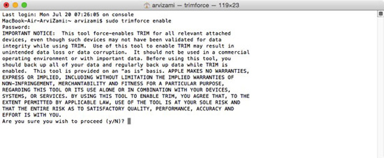 Начиная с OS X 10.10.4 Apple появилась поддержка функции TRIM. Чтобы её включить откройте Терминал (Finder → Программы → Утилиты) и введите следующую команду, после чего нажмите enter: