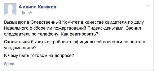 О визите полиции к одному из знакомых рассказал и пользователь Facebook Ян Черняк. В его записи говорится, что полицейский напрямую спрашивал у знакомого, посылал ли он деньги через «Яндекс» Навальному, пояснив, что информация об этом получена от интернет-компании.
