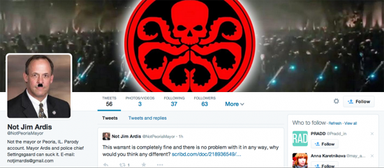 Полиция города Пеория на севере США устроила рейд в поисках автора твиттер-аккаунта @peoriamayor, высмеивающего мэра Джима Ардиса. Аресту не помешало даже то обстоятельство, что аккаунт, который поначалу вёлся под видом реального, был незадолго до происшествия обозначен как пародия.