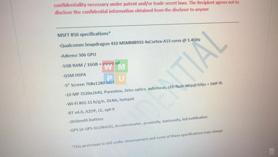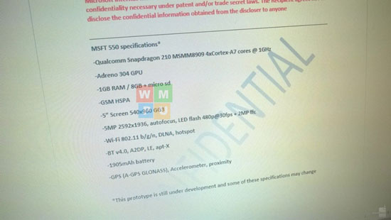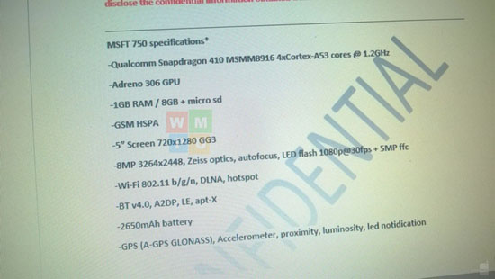 Согласно недавним слухам, новые флагманы Microsoft будут называться Lumia 950 и Lumia 950 XL. Это значит, что с выходом Windows 10 компания даст старт новой линейке смартфонов Lumia x50. Сегодня мы получили еще одно подтверждение этой информации. В Сети всплыли внутренние документы, в которых перечислены характеристики следующих смартфонов: Lumia 550, Lumia 750 и Lumia 850. Вряд ли какой-либо из этих девайсов сможет вас удивить, так как каждый из них представляет бюджетный сегмент. К примеру, Lumia 550 оснащен 5'' экраном с разрешением 540 x 960 точек, процессором Snapdragon 210, 1 ГБ ОЗУ, 8 ГБ внутренней памяти, 5-Мп основной камерой с автофокусом и вспышкой, 2-Мп фронталкой, а также батареей на 1905 мАч.