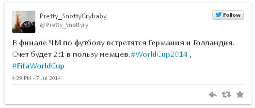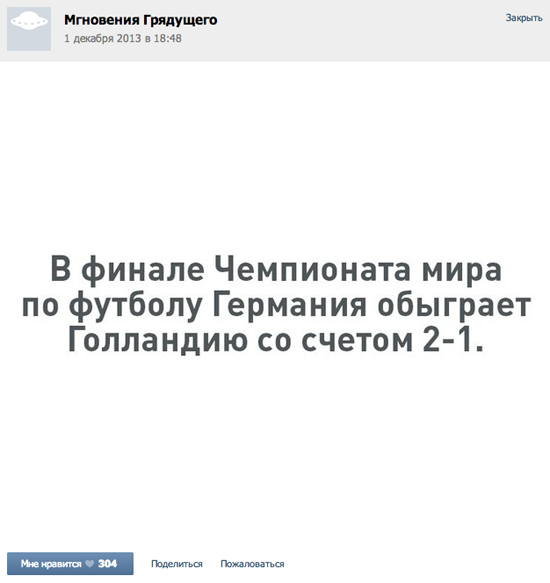 Но внезапно появившийся в поле зрения паблик пошёл и дальше «предсказаний» событий в промежутке 1 декабря 2013 — 7 июля 2014. Он решил предугадать исход Чемпионата мира по футболу: по информации «Мгновений грядущего», в финале Германия выиграет у Голландии со счётом 2:1.