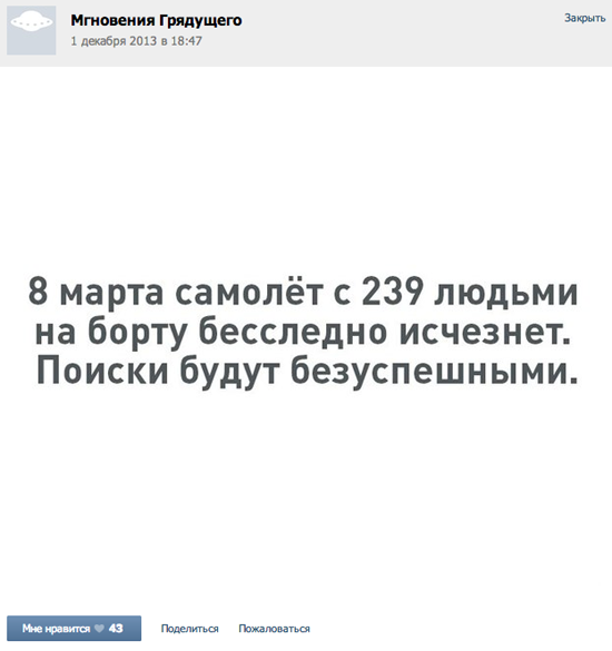 Вторая публикация связана с трагической историей вокруг рейса MH370, следовавшего из Куала-Лумпур в Пекин. В ночь с 7 на 8 марта 2014 года самолёт Malaysia Airlines с 239 пассажирами на борту (включая экипаж) пропал с радаров и так и не был найден. Позднее появлялись сообщения о том, что пассажиров официально объявили погибшими, однако поиски самолёта Boeing 777-200 ведутся до сих пор.