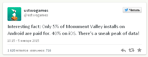 Недавно ustwo опубликовали занимательную статистику, которая вполне может это объяснить. Лишь 5 процентов пользователей Android, установивших игру Monument Valley, сделали это легально, заплатив за нее в Google Play. В своих подсчетах они не учитывали данные магазина приложений Amazon, в котором игра временно раздавалась бесплатно, но все и так достаточно показательно. Для сравнения: 40 процентов установок на iOS были легальными.
