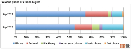 Во время начала продаж iPhone 5 в прошлом году, около 16% опрошенных покупателей заявили, что их предыдущие смартфоны работали под управлением операционной системы Android. В этом году порядка 20% принявших участие в опросе владельцев iPhone 5S и iPhone 5C признались, что решили уйти от зелёного робота и перейти на сторону Apple. В Consumer Intelligence Research Partners уверены, что в обратном направлении движется значительно меньше пользователей.