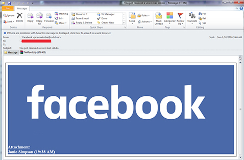 Исследователи из Comodo Threat Research Lab сообщили о новой спам-кампании, направленной на сотрудников и клиентов различных предприятий. Злоумышленники рассылают вредоносные письма, замаскированные под уведомления Facebook о получении голосового сообщения. Адрес и имя отправителя заставляют думать, будто письмо получено от соцсети, однако домен, откуда оно отправлено, в реальности не имеет к Facebook никакого отношения.