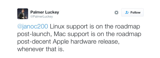 В мае создатель шлема виртуальной реальности заявил, что его компания приостановила разработку ПО для компьютеров с OS X и Linux до начала продаж устройства. На этот раз Лаки сделал более конкретное заявление, которое вряд ли устроит маководов. Палмер Лаки сказал, что в Oculus VR рассматривают возможность поддержки Linux после начала продаж устройства, но о совместимости с Mac можно будет говорить после того, как Apple выпустит «более достойное аппаратное обеспечение». Стоит отметить, что помимо мощной графической карты для подключения Oculus Rift к компьютеру нужны также два порта USB 3.0 и видеовыход HDMI 1.3.
