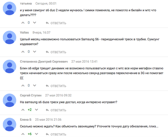 На проблему обратил внимание наш читатель Кирилл. Он является владельцем смартфона Samsung Galaxy S6 и уже месяц динамик его смартфона трещит во время разговора. К счастью, проблема не в самом динамике, треск появился после обновления ПО. К сожалению, с этой проблемой столкнулись многие другие пользователи Galaxy S6 и некоторых других моделей смартфонов Samsung. Почти каждый день на ресурсе Galaxy-Droid появляются новые жалобы пользователей, и все они говорят об одном.