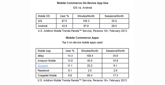 Интересно, с помощью каких приложению покупки совершаются чаще всего. Согласно отчету, это приложение eBay — на его долю приходится 14,3% всех покупок с мобильных устройств. За ним следует Amazon — 13%. Затем идет Groupon, у которого 11,1%.