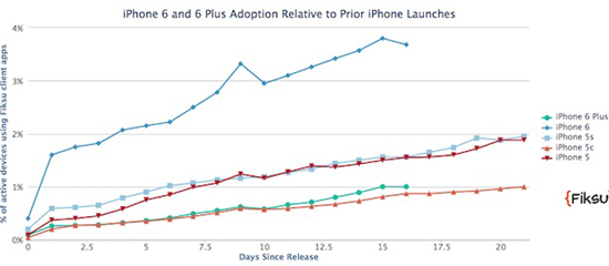 По данным MixPanel, в первые 13 дней после релиза показатели iPhone 5s и 5c достигли 2,35% и 0,72% соответственно. Это соотношение подобно текущим показателям iPhone 6 (5,02%) и 6 Plus (0,97%).