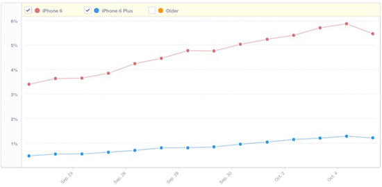 Линия тренда здесь совпадает с данными, представленными Chitika и MixPanel. Из этого можно сделать вывод, что общая тенденция для iPhone 6 определена верно.
