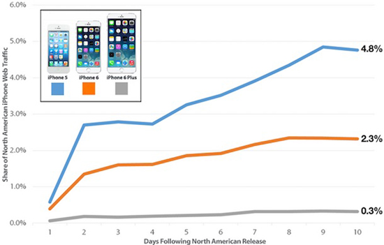 Эксперты из Chitika определяют объем трафика каждого iPhone по сравнению с общим количеством используемых смартфонов от Apple после их выхода. По данным аналитиков, в первые десять дней продаж в Северной Америке трафик iPhone 5 составлял 4,8%. Этот показатель более чем в два раза превышает объем трафика iPhone 6 (2,3%) по состоянию на конец сентября.