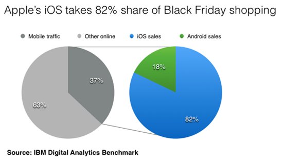 У платформы iOS зафиксирована 26-процентная доля мобильного трафика в «черную пятницу» по сравнению с 11% в активе у операционной системы Android. Активность владельцев смартфонов на базе Windows Phone и BlackBerry была настолько маленькой, что IBM не включила их в свою статистику.