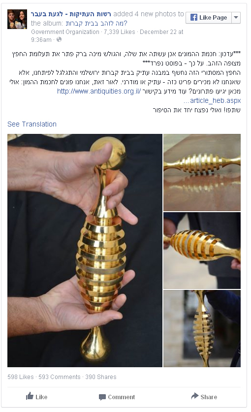 "Этот загадочный объект был обнаружен в старом здании на кладбище в Иерусалиме и передан нам. Мы не знаем, древняя это вещь или современная. Поэтому мы решили обратиться к мудрости общества", - говорится в записи.