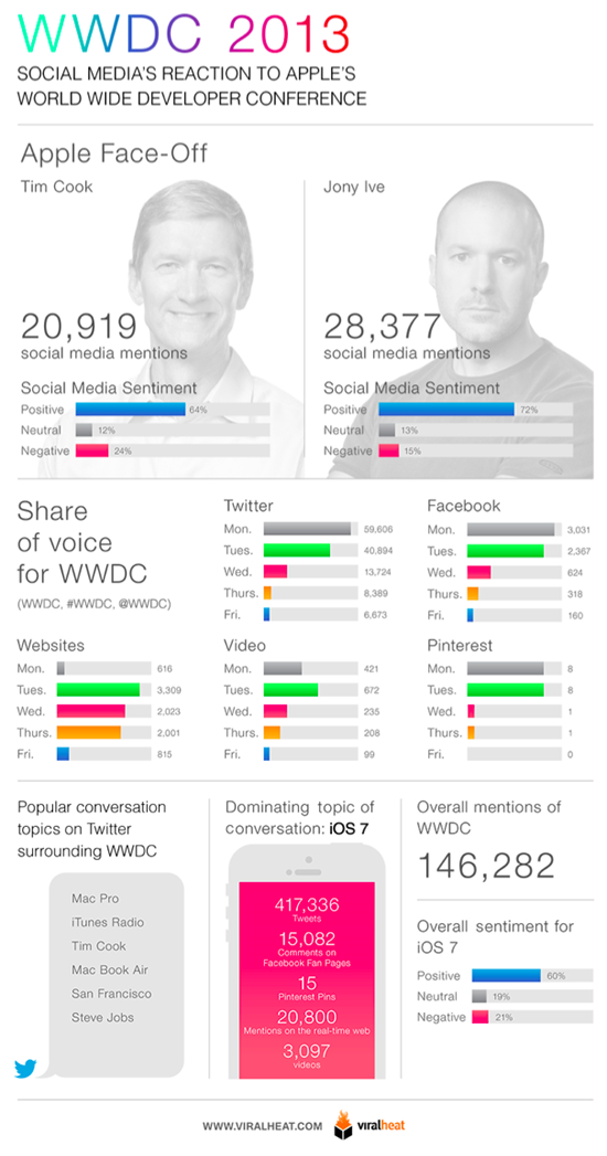 Аналитики ViralHeat проанализировали упоминания Джонатана Айва и Тима Кука в статусах социальных сетей Facebook, Twitter и Pinterest и пришли к вполне закономерному выводу. Большинство пользователей социальных сетей обсуждали Джонатана Айва, а не Тима Кука.