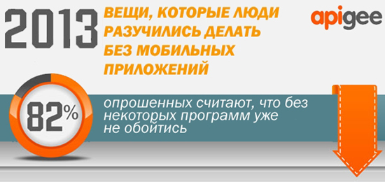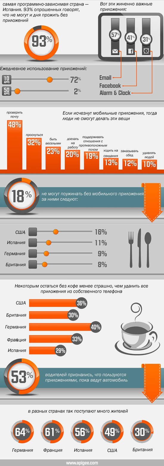 Оказывается, пользователи уже просто не могут жить без некоторых программ в своих мобильных. Без этих маленьких гаджетов и приложений в них некоторые люди даже не смогут пообедать – такие данные установило аналитическое агентство Apigee, которое создало эту инфографику. А мы ее перевели для вас .