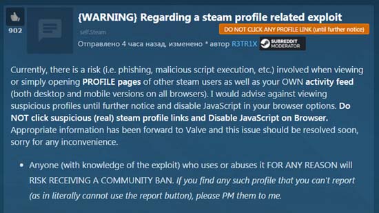 Сообщение появилось в ветви форума Reddit, посвященной цифровой сети распространения игр для PC. Администратор ветви предупредил, что уязвимость позволяет встроить на страницу профиля пользователя сторонний сценарий JavaScript. Причем этот метод работает как для PC, так и для мобильных устройств. К примеру, злоумышленники могли закачать на компьютер пользователя вредоносный код, чтобы получить полный доступ к платформе жертвы.