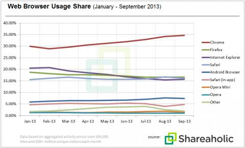 В сентябре этого года браузер Google Chrome уверенно занял первое место с долей 34.68%, превзойдя по общей доле всех трех своих основных конкурентов на ПК вместе взятых: Mozilla Firefox, Internet Explorer и Opera (16.6%, 15.62% и 1.1% соответственно). Более того, из всей этой четверки только Chrome показывает положительную тенденцию к дальнейшему росту — с января этого года доля браузера от Google выросла на 15.65%, тогда как конкуренты долю теряли, причём больше всего потерял Internet Explorer — за девять месяцев его доля уменьшилась на 23.81%. Впрочем, судя по всему, эта печальная тенденция для творения Microsoft прекратилась в августе, так как в сентябре браузер начал рост. В статистике Shareaholic самым интересным является третье место, которое удерживает Safari от Apple с 16.15%. Данный показатель генерируется отнюдь не версиями для Mac OS X или Windows, а системой iOS, где он является основным и самым производительным браузером из-за ограничений Apple на использование другими браузерами JIT-компиляции JavaScript-кода. Самым быстрорастущим браузером за год стал стандартный веб-обозреватель Android, увеличивший свою долю на 26.75% до 7.39%.