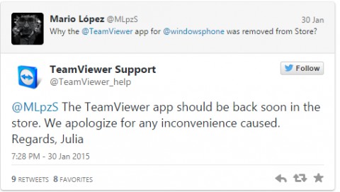 Любопытно, что служба поддержки TeamViewer в Twitter на вопрос одного из пользователей заверила, что приложение в скором времени должно вновь появиться в Windows Phone Store.