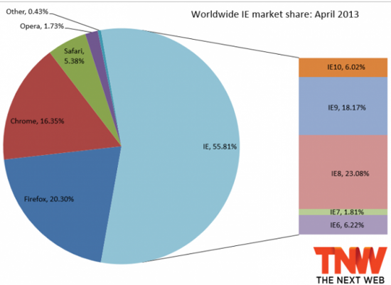 По всей вероятности, многие нынешние поклонники Internet Explorer 10 не пользовались ранее этим браузером именно из-за нежелания переходить на новую версию “форточек”, и как только вышла его финальная редакция для Windows 7, лед, что называется, тронулся. При этом интернет-обозреватель Microsoft в целом сохраняет уверенное лидерство на рынке со своими 55,81 процентами, в то время как его главные конкуренты Mozilla Firefox и Google Chrome по данным за апрель имеют 20,3 и 16,35 процента рынка соответственно.