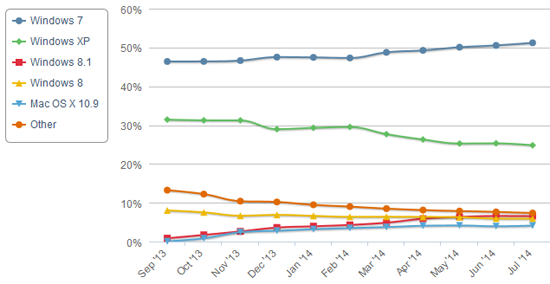 По данным, опубликованным известным ресурсом NetMarketShare, за последний месяц популярность семейства Windows 8 не только не выросла, но и упала, пусть и незначительно, всего на 0,06 %. Общая доля Windows 8 и 8.1 составляет всего 12,48 %, что намного меньше даже показателя Windows XP. А вот Windows 7 медленно, но верно продолжает отъедать долю рынка у своих соперников и на текущий момент занимает целых 51,22 % от всех настольных операционных систем.
