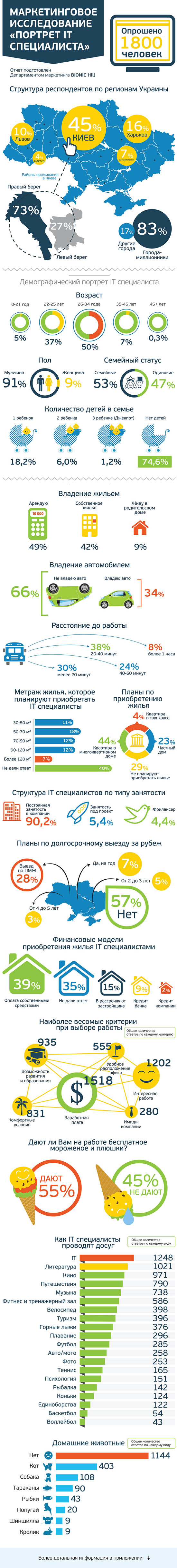 В 90 % случаев IT специалист — это мужчина в возрасте от 22 до 34 лет. До проведения исследования существовало предположение, что 70 % специалистов не имеют семьи. Как оказалось, 53 % состоят в браке, но при этом у 74 % нет детей. Данный факт можно связать с нерешенностью вопроса обеспеченности собственным жильем. Так, стало понятно, что из 1800 респондентов 58 % не имеют собственного жилья. Важно учесть, что 90 % участников опроса работают в компаниях на постоянной основе.