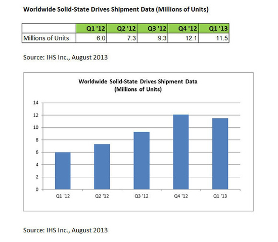 Высокая популярность планшетных компьютеров и компактных тонких ноутбуков привели к значительному росту поставок SSD в 2013 году. По данным IHS, более 11,5 миллионов SSD было отгружено только за первый квартал нынешнего года.